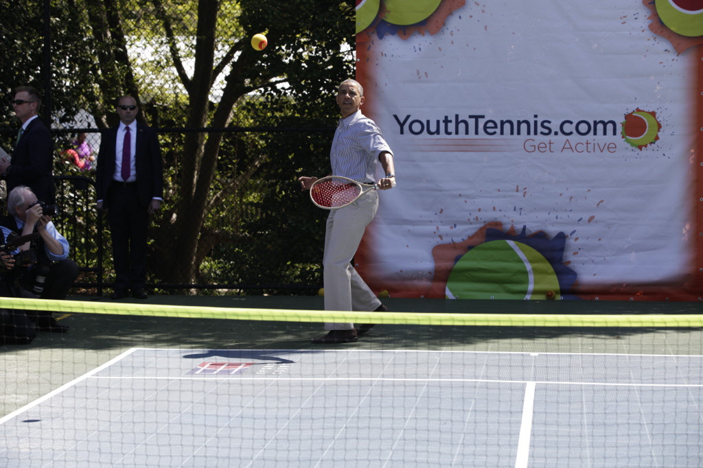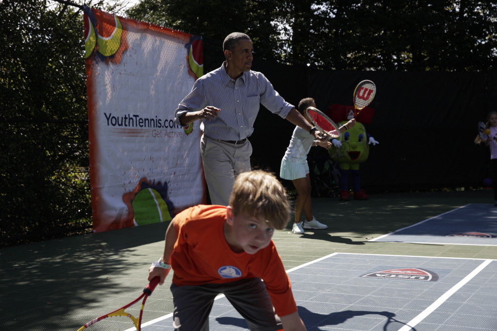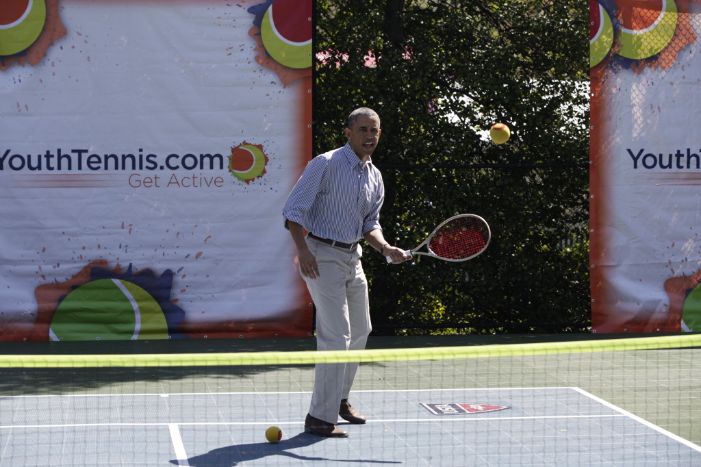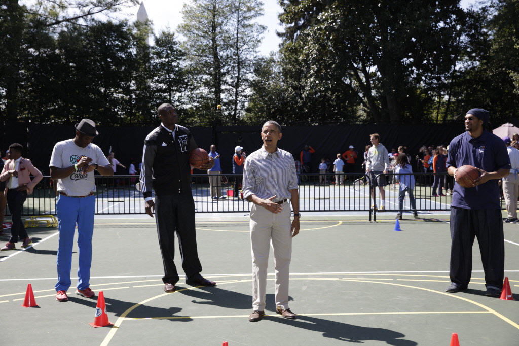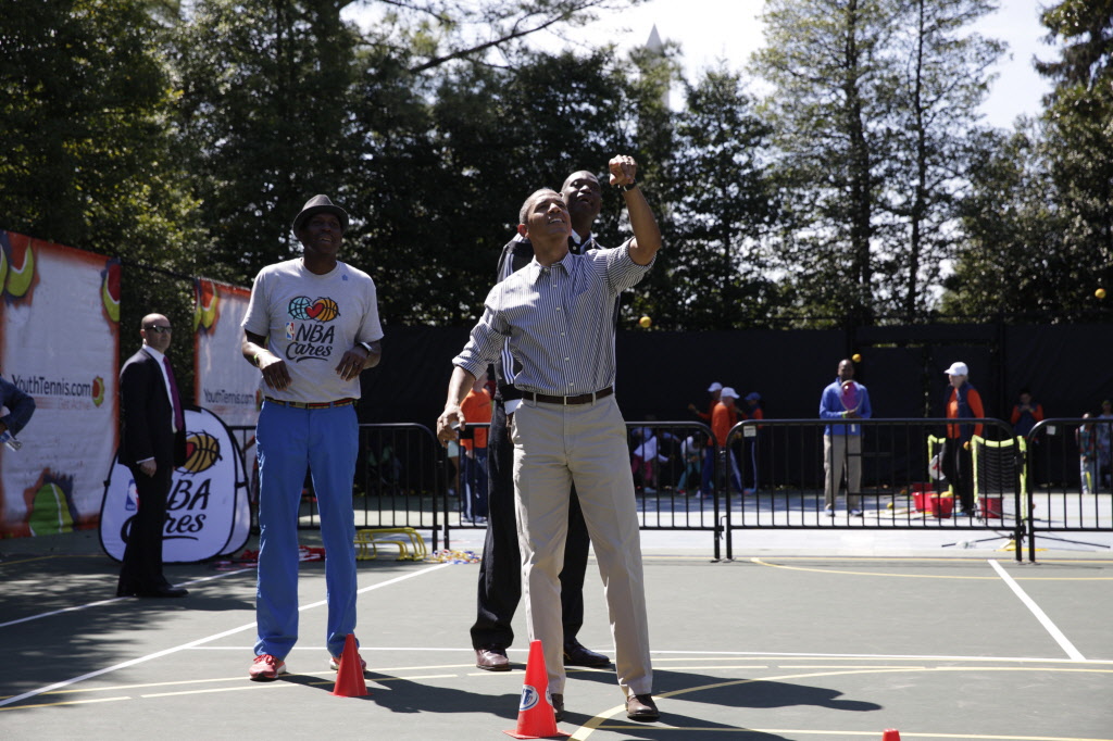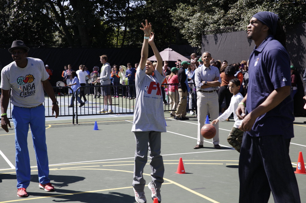 This contains photographs of the President and First Lady (along with their daughters) greeting participants and guests; delivering remarks; cheering on participants at the starting line of the Easter Egg Roll; and reading to children. There are also photos of President Obama participating in basketball and tennis clinics, Mrs. Obama being interviewed by the media, and