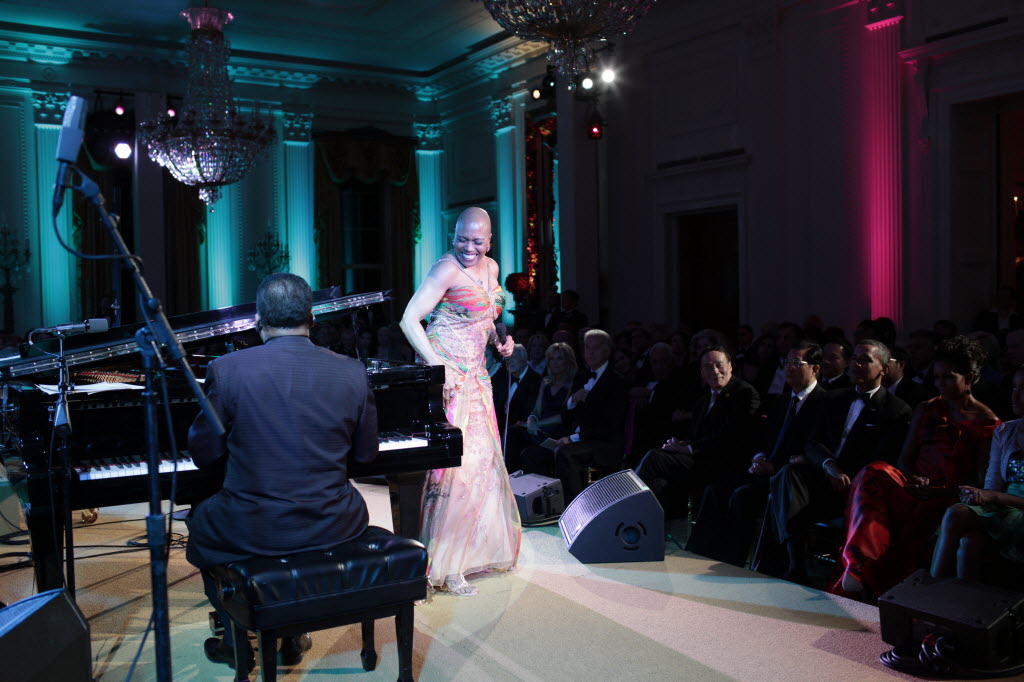 There are photos of President Jintao’s arrival; a private reception in the Yellow Oval Room; greeting guests in the Grand Foyer; President Obama and Prime Minister Sign delivering toasts; and performances by Herbie Hancock, Lang Lang, Chris Botti, Dee Dee Bridgewater, Peter Martin and Dianne Reeves.